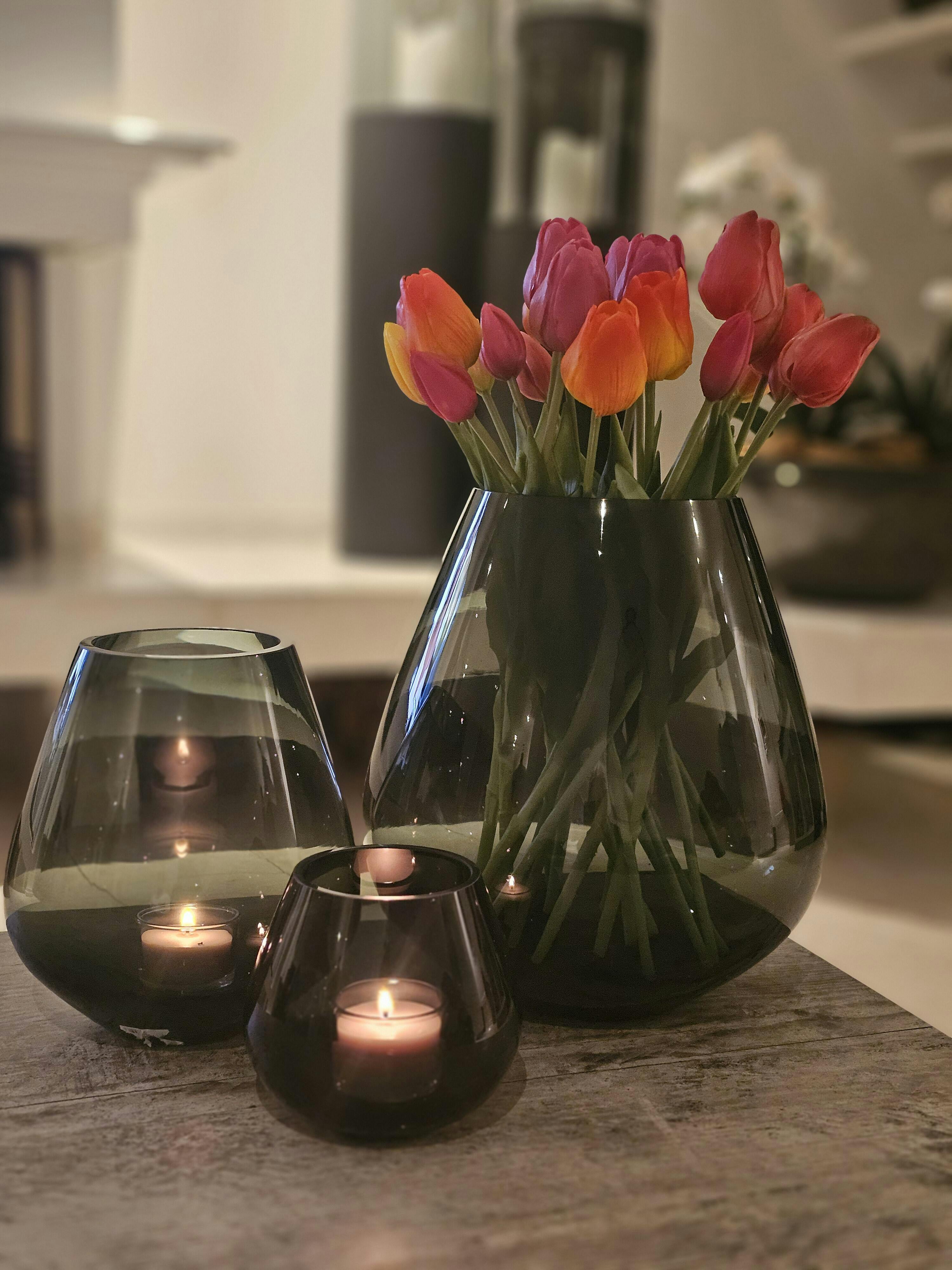 Prachtige kleur, heel warm. Mooi met een kaarsje maar ik heb hem nu staan met zijden bloemen. 👌